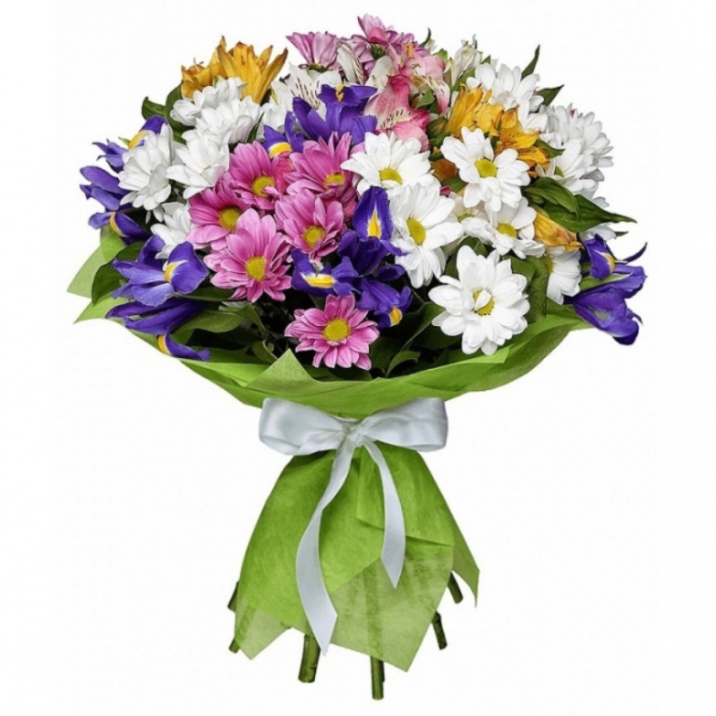 Букет состоит из 5 веток хризантем, 5 альстромерий, 9 ирисов, зелень, красивая упаковка, атласная лента.