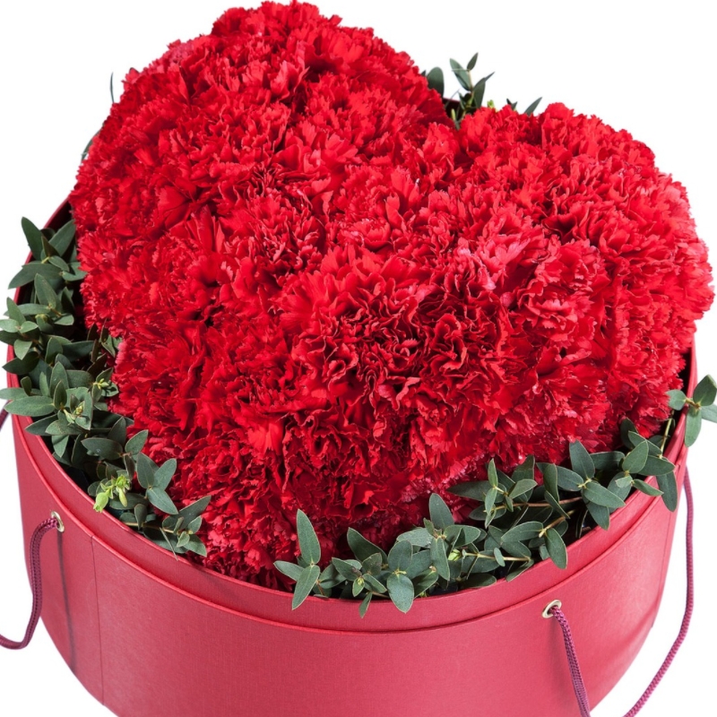 Букет состоит из 39 красных гвоздик, зелень, коробка, оазис.
