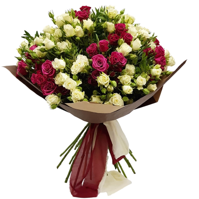 Букет состоит из 15 белых кустовых роз, 10 малиновых кустовых роз, крафт, атласная лента.
