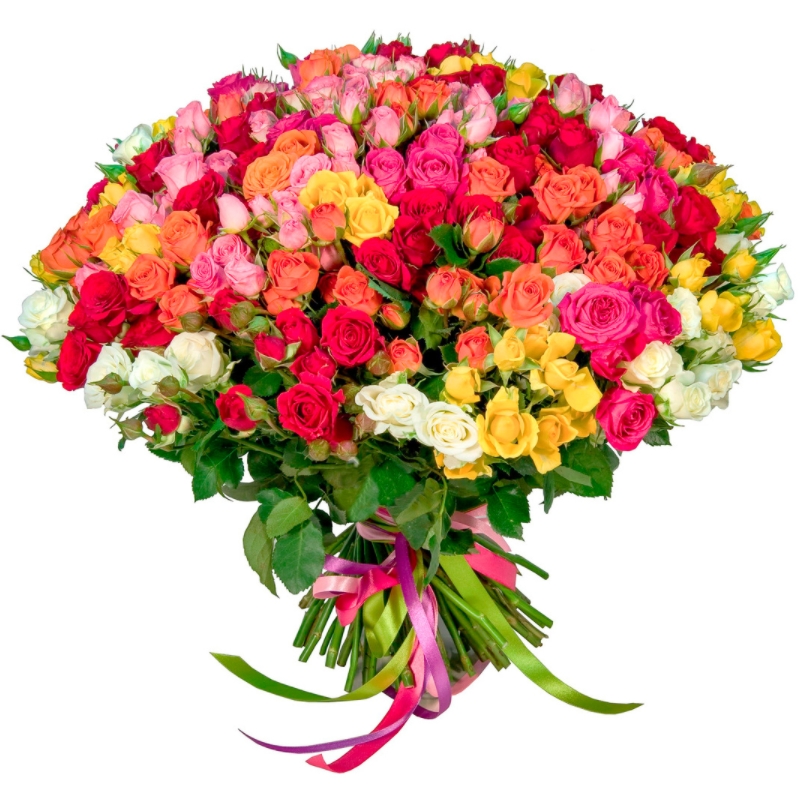 Букет состоит из MIX из 101 кустовой розы, прозрачная упаковка, атласная лента.