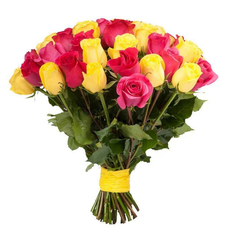 Букет состоит из 16 розовых роз, 15 желтых роз, прозрачная упаковка, атласная лента.