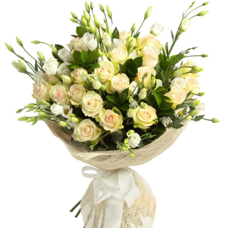 Букет состоит из 7 веток кремовых кустовых роз, 5 веток эустомы, зелень, сизаль, атласная лента.
